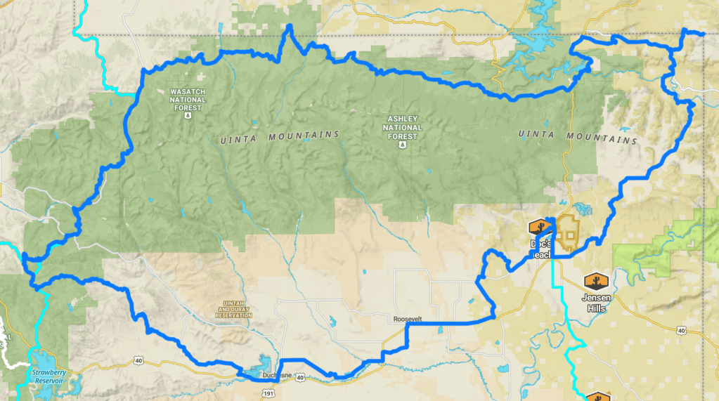 - Start/End: It’s a loop, so it can be done anywhere. Suggestions: Vernal, Mirror Lake Highway, Strawberry Reservoir area, or the top of Timber Lakes east of Heber City.