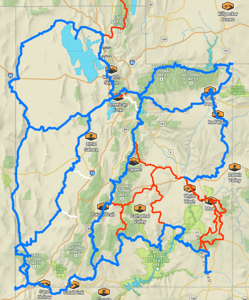 This off-road adventure trail travels from Highland, Utah, to Bluff, Utah. Along the way, it passes through Green River and Moab. The trail has high mountains and low valleys, fast desert roads, and blue-level rock trails. This trail will give you a taste of everything that makes Utah trail riding so special. It has remote…